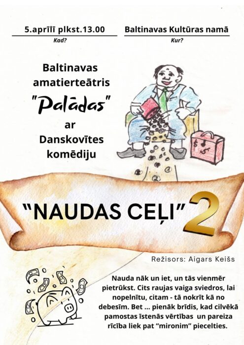 Lela nūtikšona svātdiņ, Pyrmajā Leldīnē, gaidoma Bolvu nūvoda Baļtinovā. Tī pyrmizruodi pīdzeivuos amaterteatra “Palādas” jaunuokais īstudiejums “Naudas celi 2”, kas ir turpynuojums skateituojim jau labi zynomajai Danskovītis lugai “Naudas celi”. Izruodis režisors – Aigars Keišs.