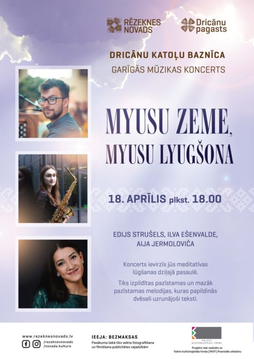 18. aprelī 18 stuņdēs Drycānu Svātūs apustuļu Simeona i Judys Romys katuoļu bazneicā byus goreiguos muzykys koncerts. Ik pa laikam cylvāks grib atrast kaidu dziļuoku jāgu sovam kasdīnys skriejīņam. Tod vajag nūstuot i palikt vīnam ar sevi pošu. Taida vareiba tiks dūta koncertā “Myusu zeme, myusu lyugšona”.
