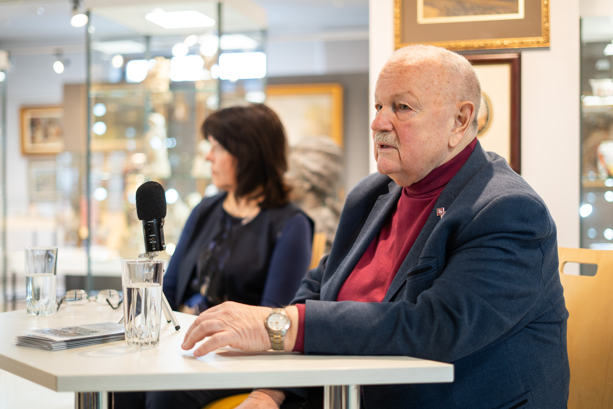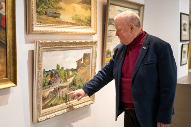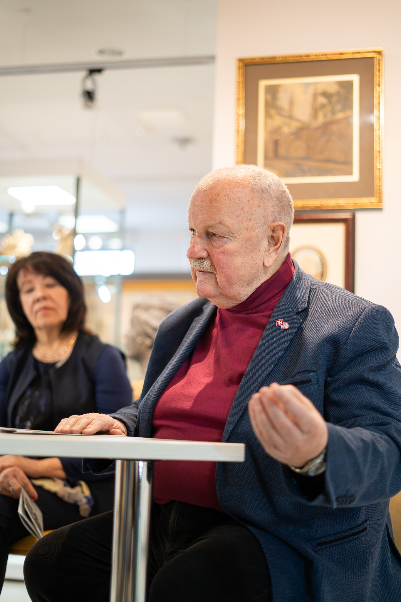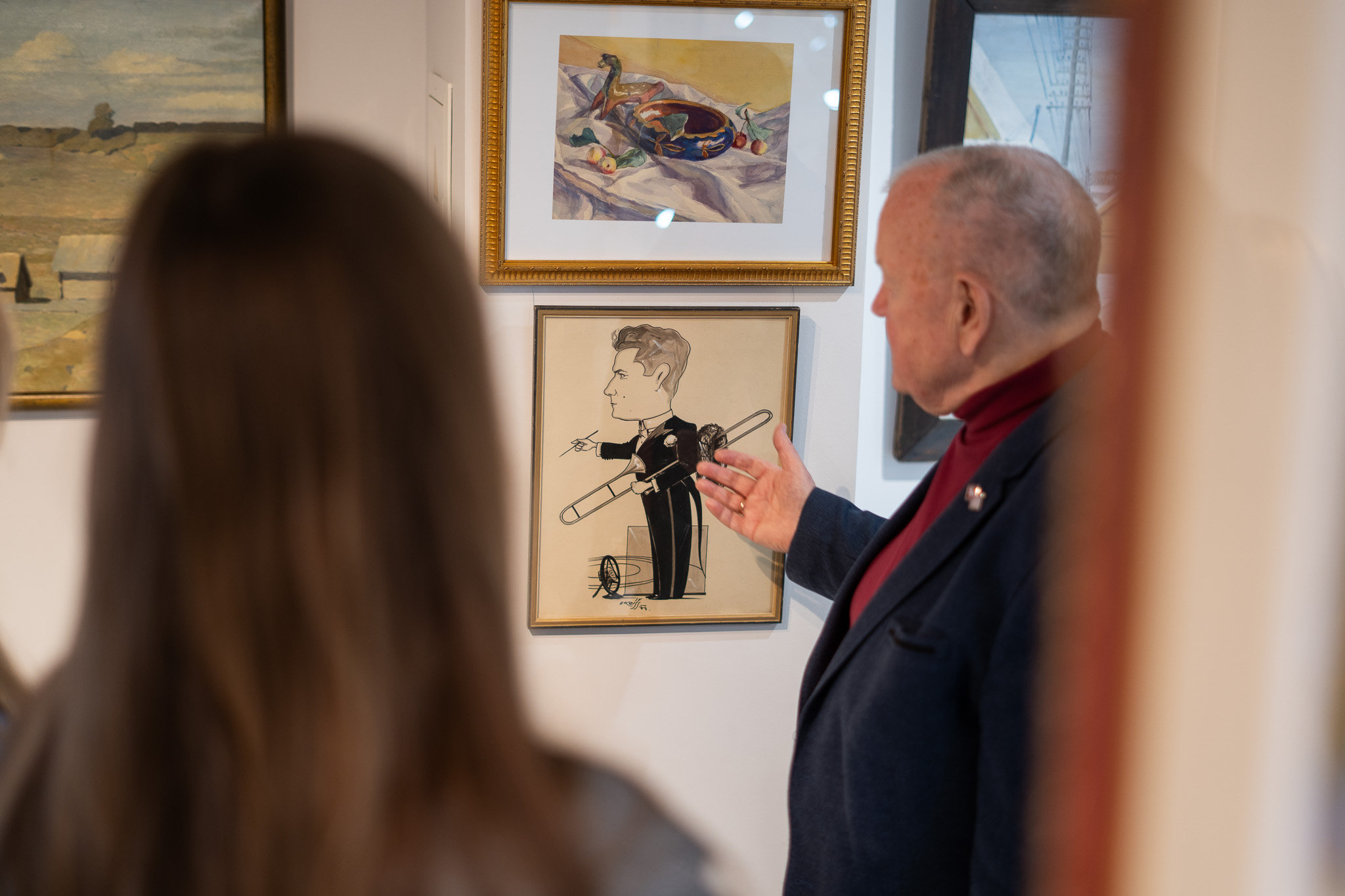 Karteņā: Juoņs Žugovs stuosta par izstuodis eksponatim. Foto: Amanda Anusāne/portals lakuga.lv