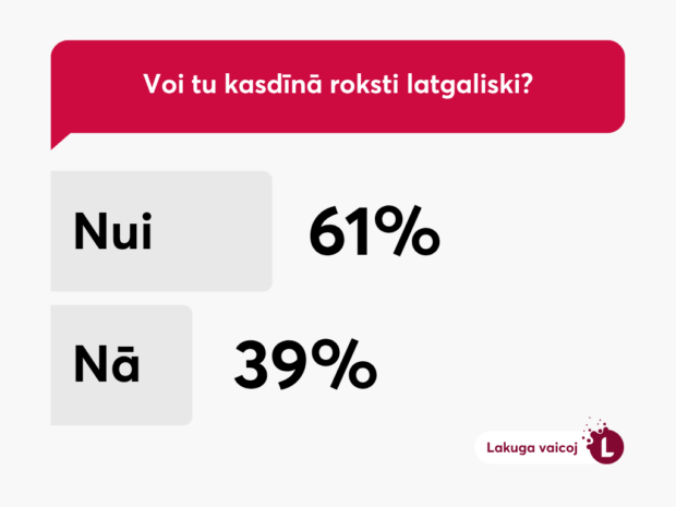 Vaicuojom portala lakuga.lv skaiteituojim, voi jī kasdīnā roksta latgaliski. Prīcynoj, ka vaira nakai puse atbiļdiejušūs, t.i., 61 % saceja, ka roksta. Sovpus iz vaicuojumu, voi da šam ir dzierdiejuši jiedzīni “trešuo izlūksne”, vairums atbiļdēja, ka nav dzierdiejuši. Byutiski redzejuos ari saprast, kaids ir portala skaiteituoju redziejums partū, kod bārnim vajadzātu suokt latgalīšu volūdys vuiceišonūs. Pīduovuojom treis atbiļžu variantus: ”bārnuduorzā”, “školā”, i “kod pats grib”. Vairums izalaseja atbiļdi “bārnuduorzā”.