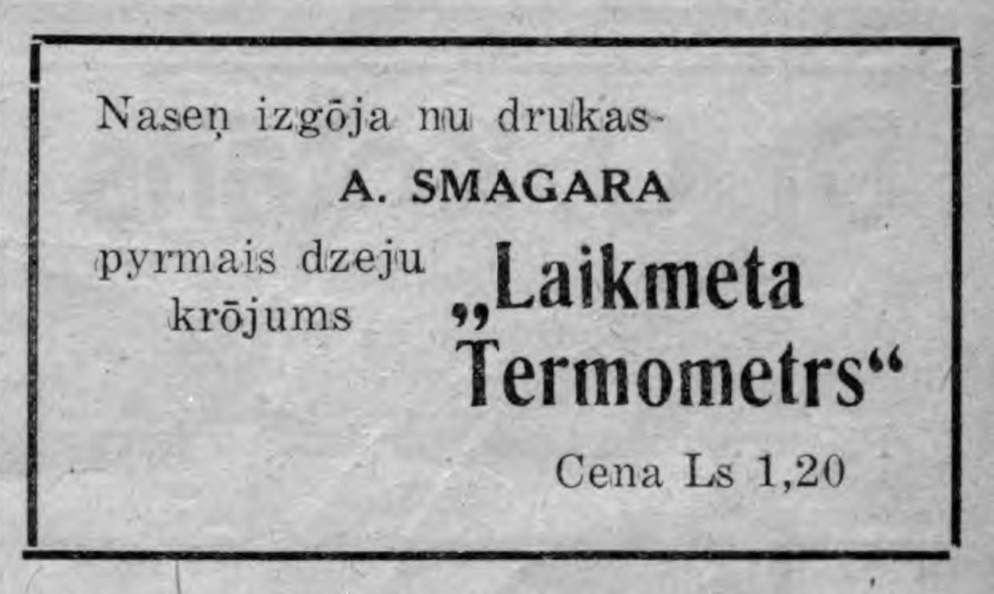 1932. godā izguoja juo debejis dzejūļu kruojums ”Laikmeta termometrs”. Augusts Smagars ir pyrmatkluojiejs daudzuos lītuos – itys dzejūļu kruojums ir pyrmais, kur vīnūs vuokūs ir dzejūli i latviski, i latgaliski.