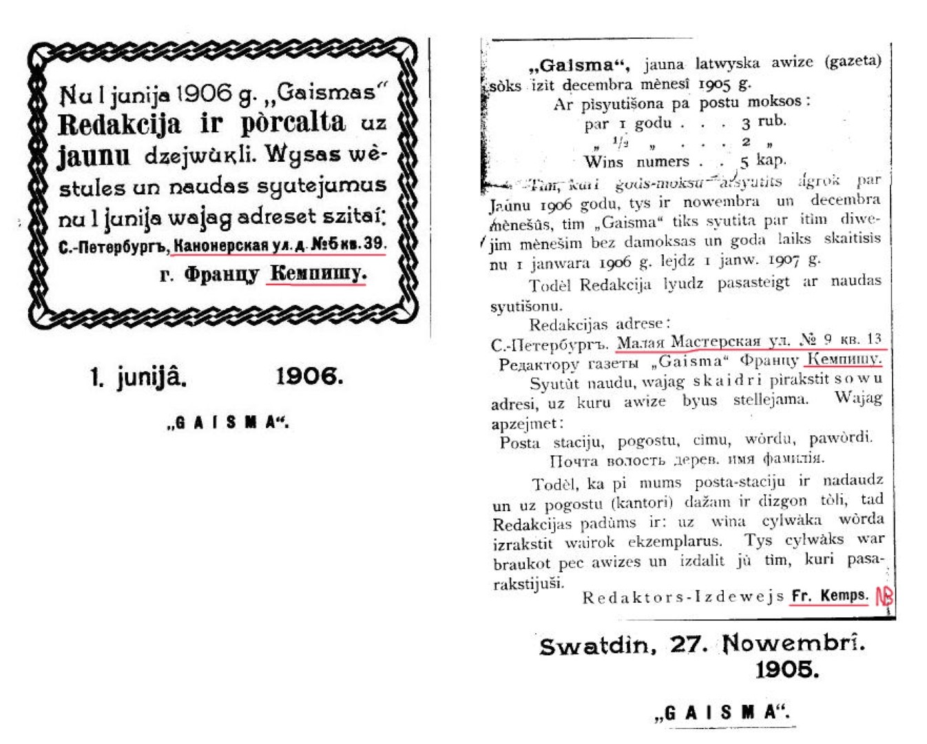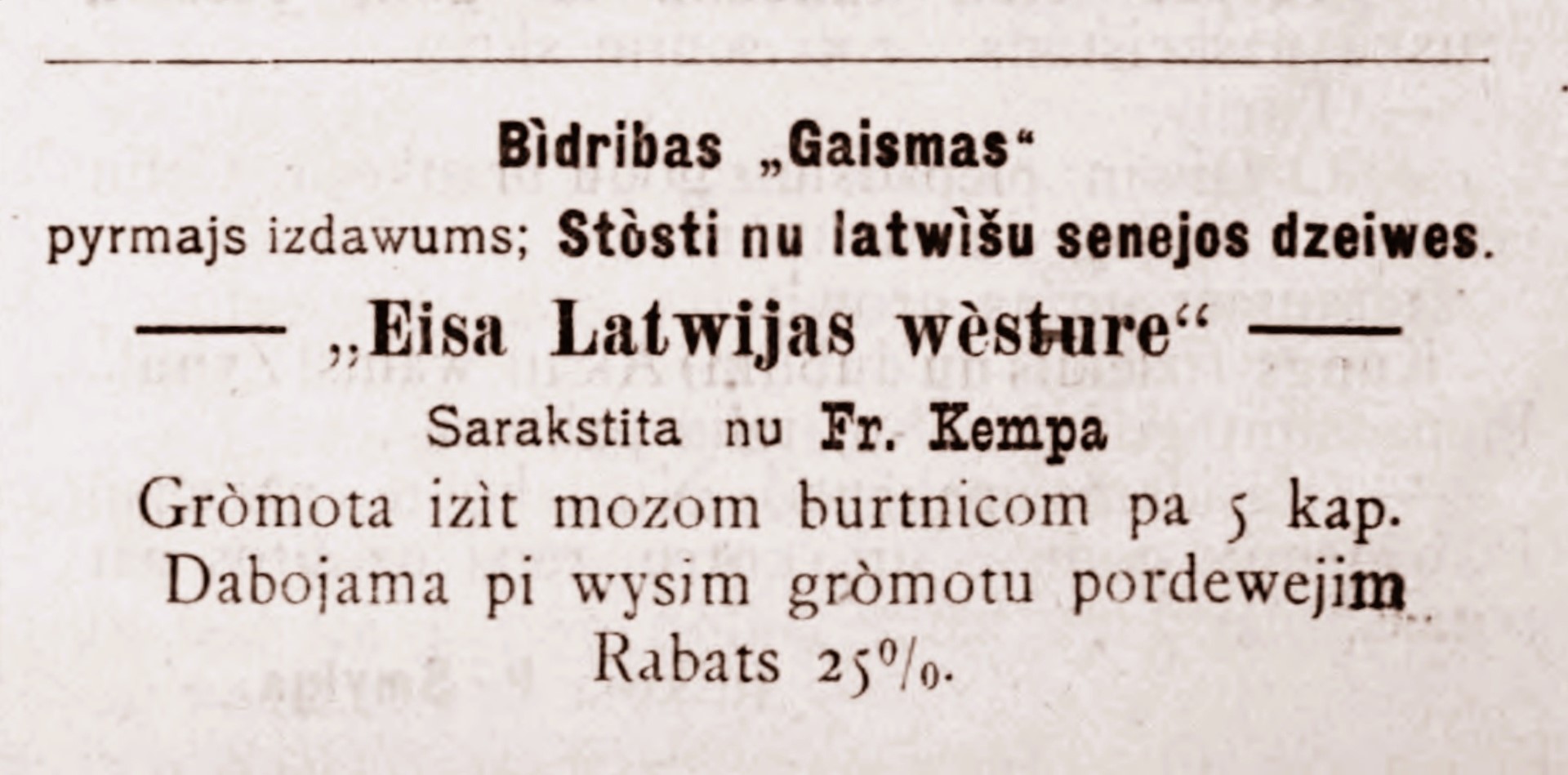 Franča Kempa izdūtuo i redigietuo gazeta „Gaisma” naizguoja ilgi – nu 1905. leidz 1906. godam, kūpā 26. numeri.