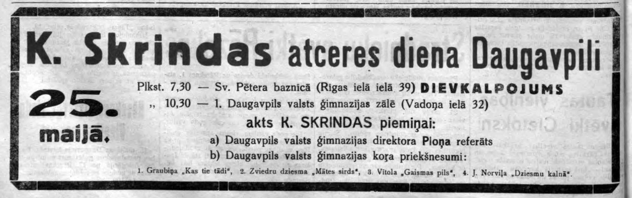 [10] Strods J. Bzkga Kazimira Skrindas pīmiņai // „Zīdūnis”, 1925., Nr. 3.