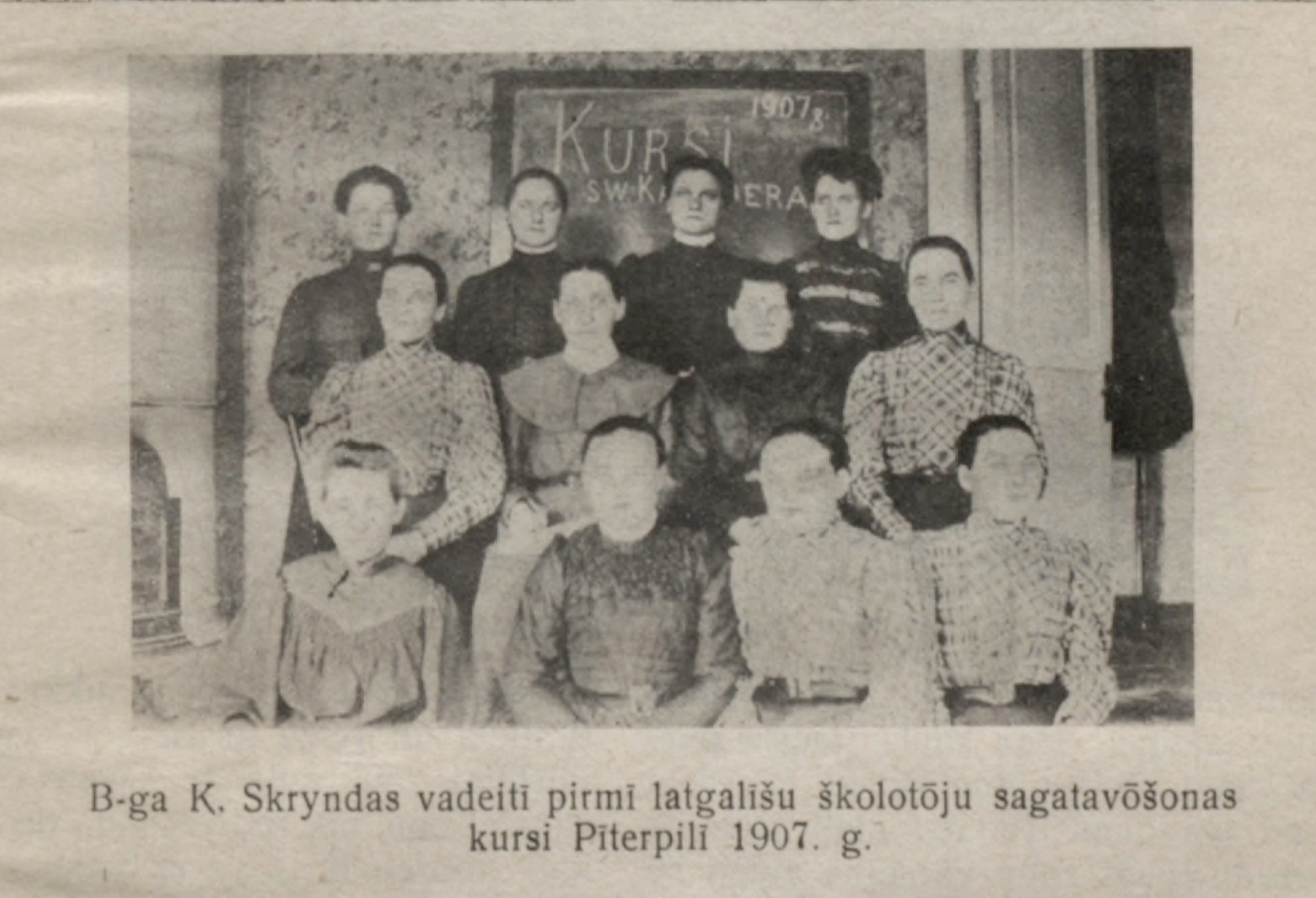 Pyrmī latgalīšu školuotuoju sagatavuošonys kursi aizasuoce Pīterpilī 1907. godā[7], tūs organizēja i vadēja Kazimirs Skrynda. Tymūs kursūs apvuicēja vysom tom lītom, lai kursants varātu kai eksterns voi pošvuiceibnīks nūkuortuot ekzamenus i dabuot školuotuoja tīseibys. Ekzameni beja krīvu volūdā, partū dūmoju, ka pamatā ari apvuiceibys volūda kursūs beja krīvu. Dūmoju, ka kursūs sovā storpā latgalīši runuoja latgaliski. Cīši īspiejams, ka kursūs tyka vuiceita ari latgalīšu volūda i stuosteits par Latgolys viesturi.