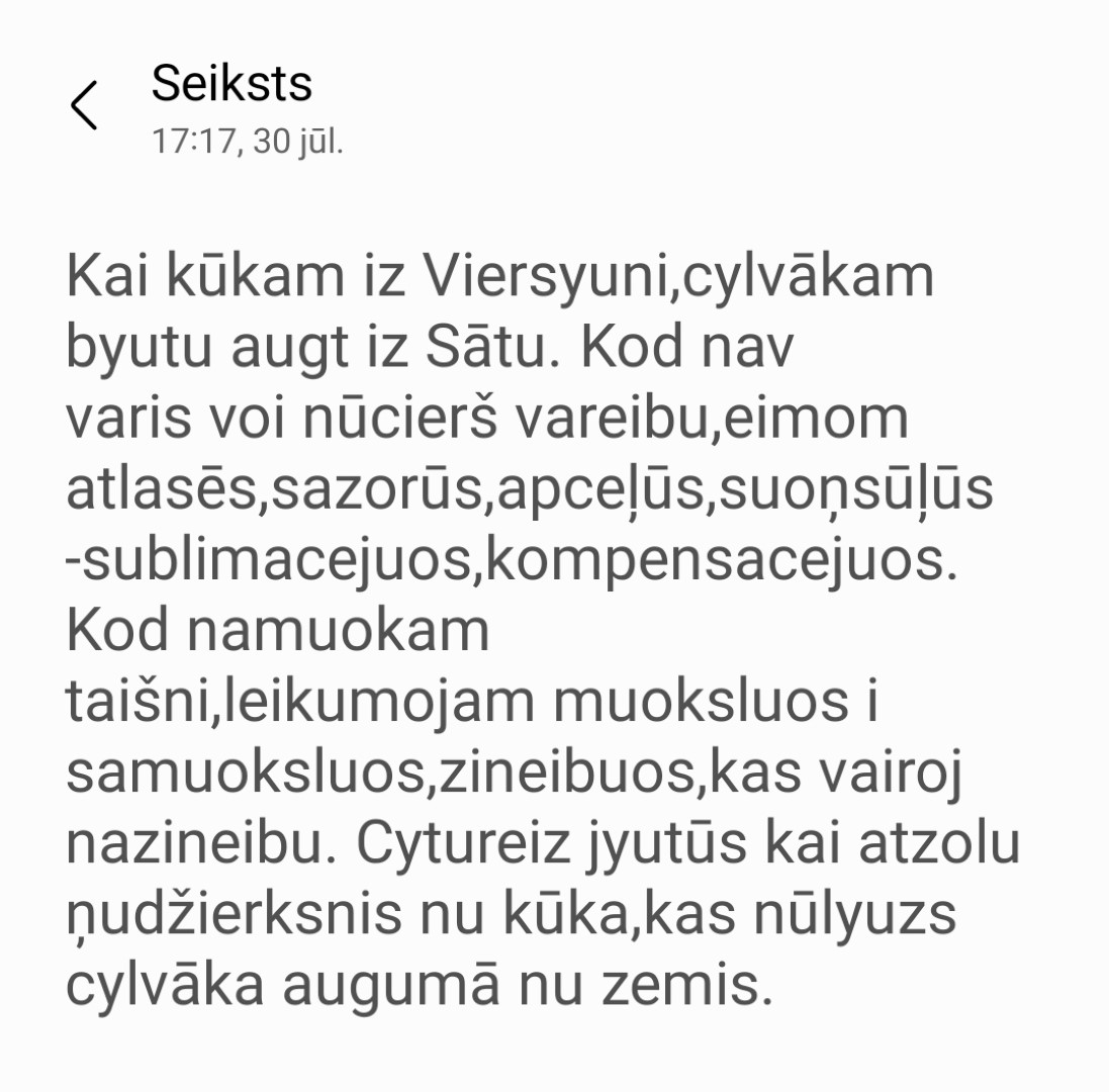 “Zalta uobeli nu ezoteriskuo sada izmuoneit ir gryuta līta. Napīteik ar tū, ka esi tics vydā. Juoteik i uorā. Var jau palikt iz vysa laika tī – aizasameibā, kur nav atbiļžu, par tū ka nav bejs vaicuojumu. Tys ir tys, kū pasaceja ar buorzdu apaugušais. Moksa par taidu izaicīni var byut sova dzeiveiba. Ni vairuok, ni mozuok. Liduojums par bezkrosta okeanu, elpuojums zam iudiņa. Vysleidza myusim daīs atsagrīzt. Vysmoz, cikom asam dzeivi. I tūlaik jau svareigi – voi i cik tu variesi atnest nu tīnis iz iteini.”[11]